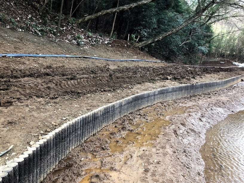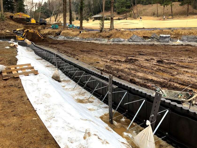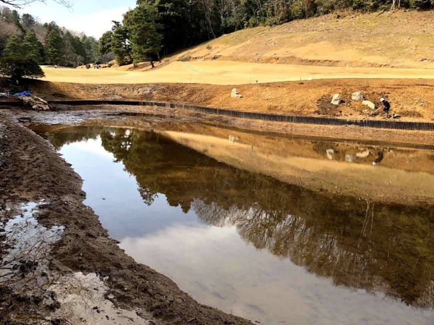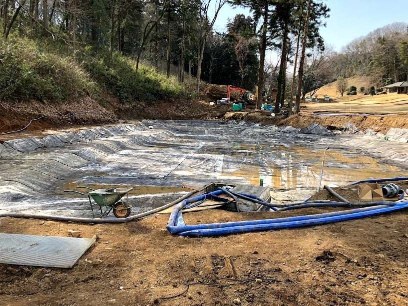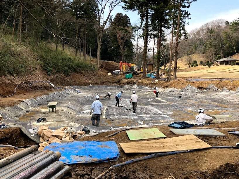 商業施設 護岸工・石積工・法面工 ゴルフ場修景池改修工事 ゴルフ場修景池改修工事を実施しました。防水の経年劣化時期になえい、修景池の改修依頼が増えてきました。こちらは、ベントナイトシートによる池の防水工事と共に、擬木柵にて外周を土留工事させていただきました。 前の施工事例 土木(舗装・砂防・河川・管路など) 埼玉県吉見町 27大市第301号用水路護岸工事 次の施工事例 土木(舗装・砂防・河川・管路など) 埼玉県比企郡川島町 河川改修工事(横塚川護岸工)