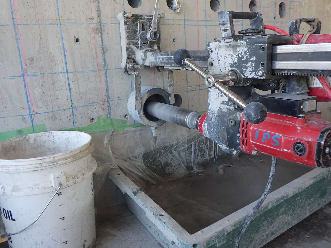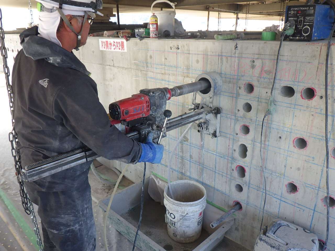 橋梁の耐震性能向上を目的とした改修工事において、あと施工アンカーの設置作業を行いました。既存構造物への確実な補強を実現するため、慎重な位置決めと高精度な穿孔作業を行い、構造体との一体化を図りました。
