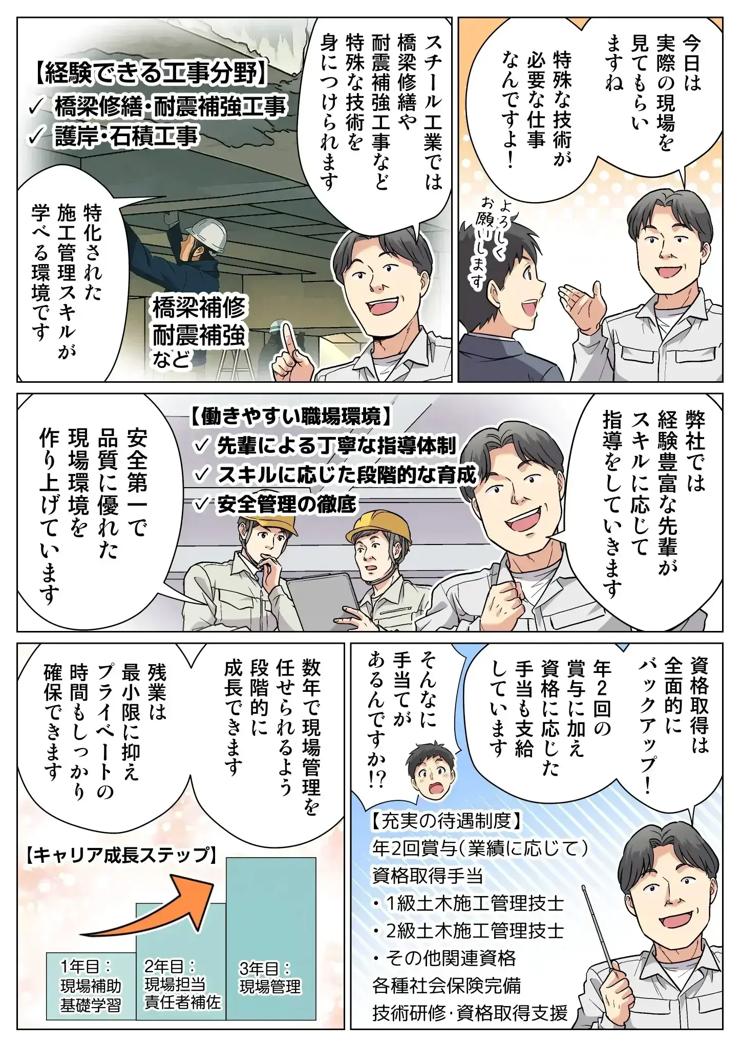スチール工業では、施工管理技士の半数が未経験スタート。現場の基礎から専門技術、資格取得まで、会社が責任をもって育成しています。未知の世界への挑戦でも、給与を得ながら国家資格にチャレンジでき、確かなキャリアを築ける環境です。