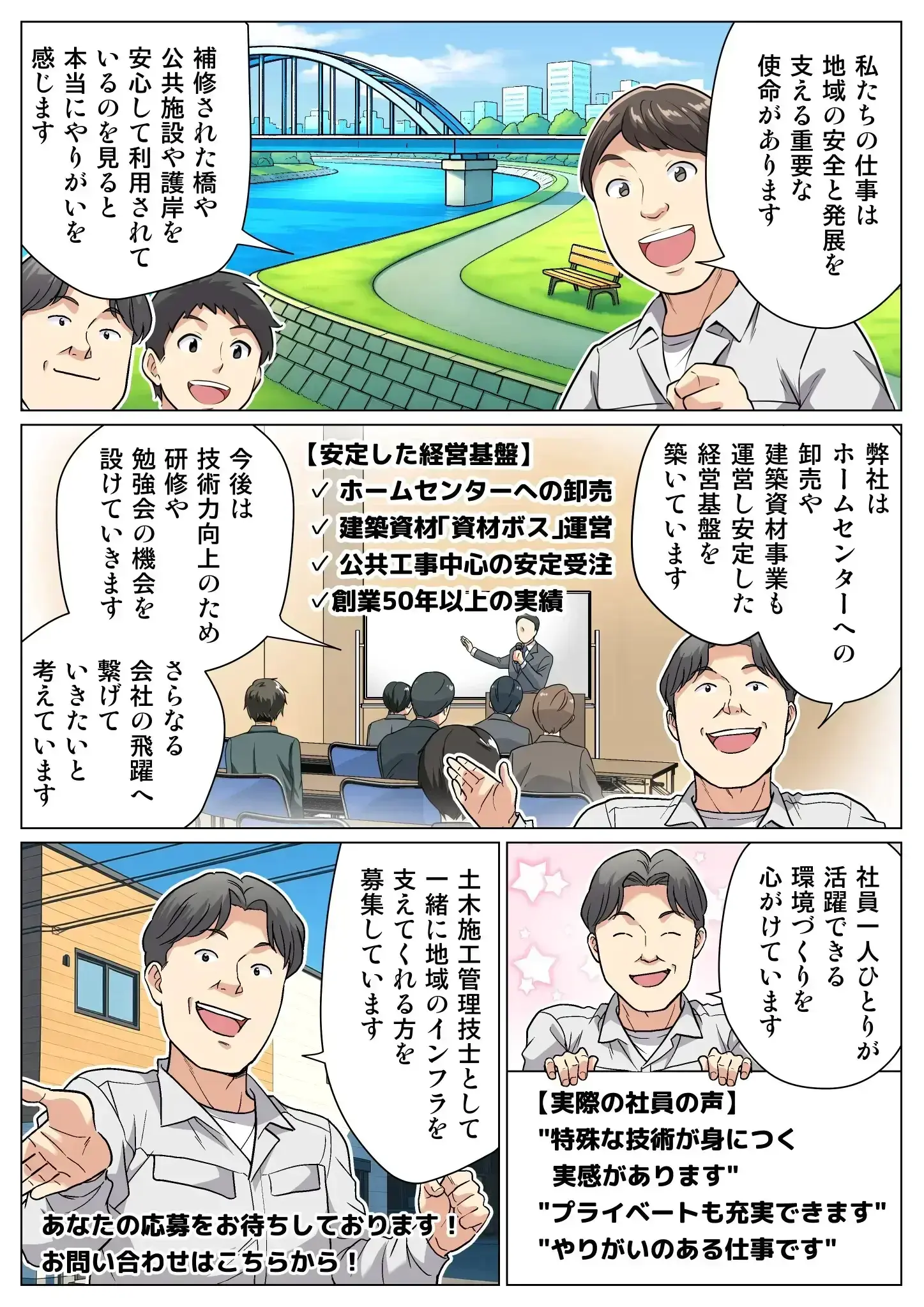 橋梁や護岸の補修という社会インフラを支える仕事に携われる点です。目に見える形で地域社会に貢献できるのが醍醐味です。施工内容も多彩なので、現場毎に新たな発見があります。